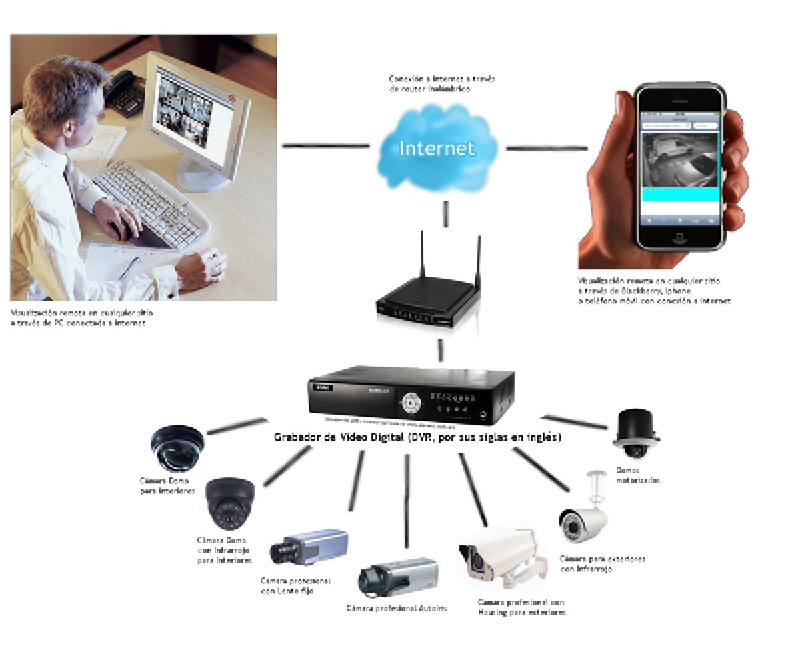 Diseño que incluye la arquitectura de CCTVs establecidos en distintos puntos geográficos con internet sateletital y ciberseguridad que previene intrusiones al monitoreo y registro de las operaciones.
